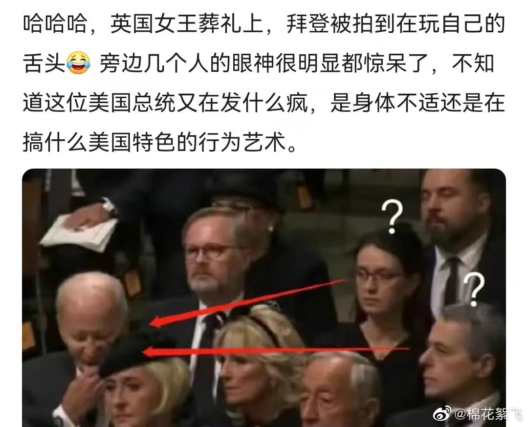 来源:棉花絮飞 女王葬礼上,拜登被拍到行为艺术,周围人看呆了。女王葬礼那么隆重的场合。