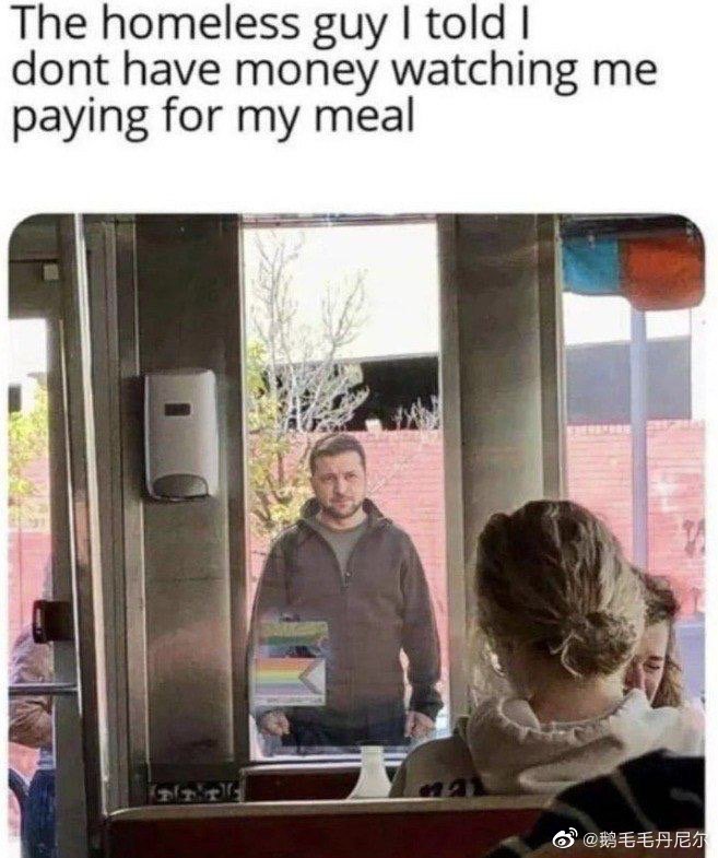 来源:鹅毛毛丹尼尔 我跟流浪汉说我没钱,然后他看见我在付饭钱。”在美国社交网络上,每天都有越来越多的表情包在嘲笑泽连斯基。