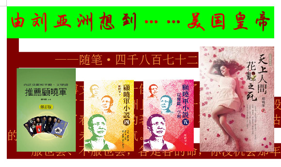 由刘亚洲想到……美国皇帝 ——随笔·四千八百七十二 那谁的博文,经人一倒手就成了大新闻。 我百度了下「刘亚洲」词条,一切如旧,好像没有发生啥。 顺便看了看刘亚洲的著作等等,不算很丰盛; ...