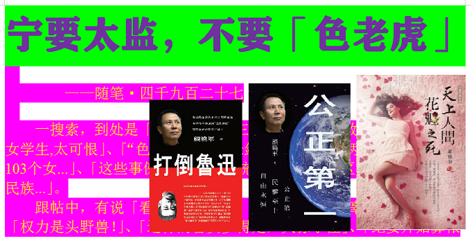 宁要太监,不要「色老虎」 ——随笔·四千九百二十七 一搜索,到处是「教育局长"王三亿"!与103名女教师有染,糟蹋18个女学生,太可恨」、「“色老虎”王胜战:敛财3个亿,包养两名女校长,祸害103个女. ...