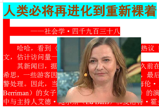 人类必将再进化到重新裸着 ——社会学·四千九百三十八 哈哈,看到〈英国女子裸体上电视节目引热议 辩论毫不尴尬〉一文,估计访问量一定不低。 其新闻曰,据英媒《LADBible》报道,不久前在伦敦的 ...