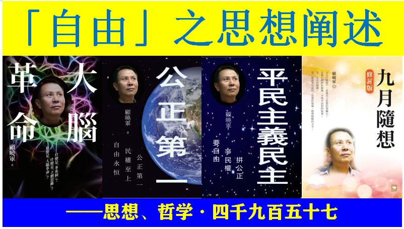 本帖最后由 顾晓军 于 2023-8-3 21:00 编辑 「自由」之思想阐述 ——思想、哲学·四千九百五十七 自由,既是一种思想,也是一个哲学概念。 「自由论」在「顾晓军主义哲学」中,是「公正第一、民 ...