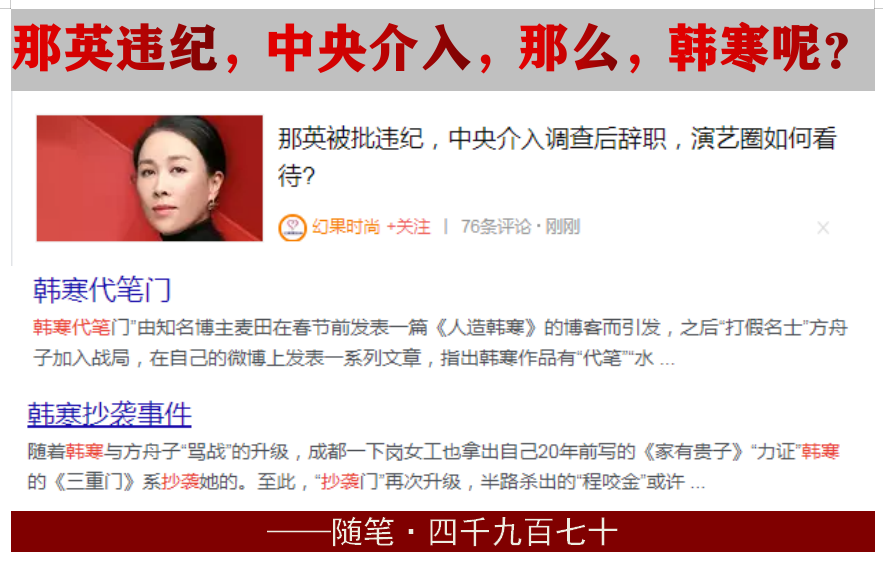 那英违纪,中央介入,那么,韩寒呢? ——随笔·四千九百七十 见到360首页有〈那英被批违纪,中央介入调查后辞职,演艺圈如何看待?〉,我忍不住点了进去。因为,除了那英有名外,最主要的是— ...