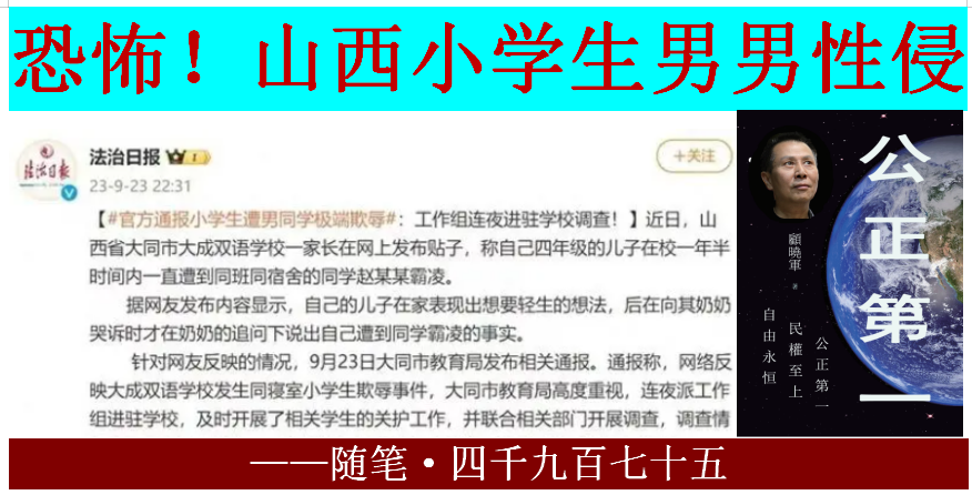 恐怖!山西小学生男男性侵 ——随笔·四千九百七十五 【近日,山西大同大成双语学校的一起霸凌事件,真的是震碎三观,让人血压飙升,愤怒到极点。 【一个年仅10岁,才上四年级的学生,竟然被欺负了 ...