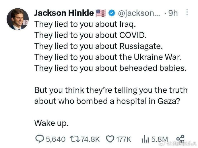 来源:地球镜头A 他们在伊拉克问题上对你撒了谎。 他们在新冠病毒问题上对你撒了谎 他们在通俄门事件上对你撒了谎。 他们在乌克兰战争问题上对你撒了谎。 关于被斩首的婴儿,他们对你撒了谎。 您认为他们 ...