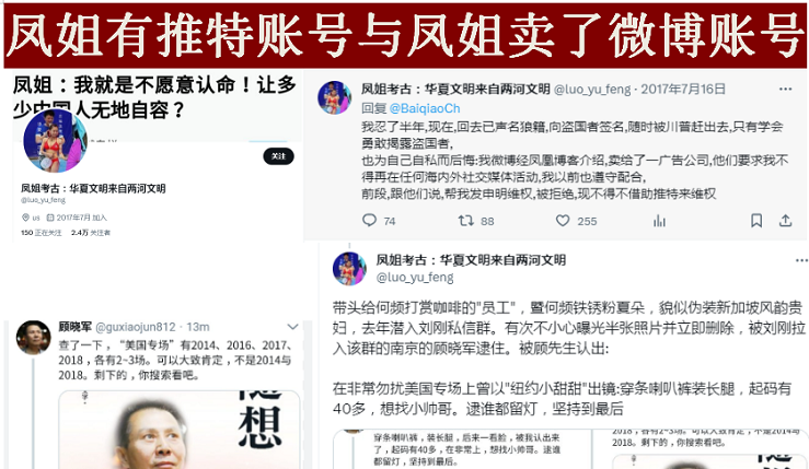 凤姐有推特账号与凤姐卖了微博账号 ——随笔·四千九百九十五 年中(2023-6-13),因冒充黄兴的后代的齐彧,说凤姐「据说她拿了顾晓军的钱,不上推」,我写了篇〈凤姐不上推特,怪她拿了顾晓军的钱〉 ...