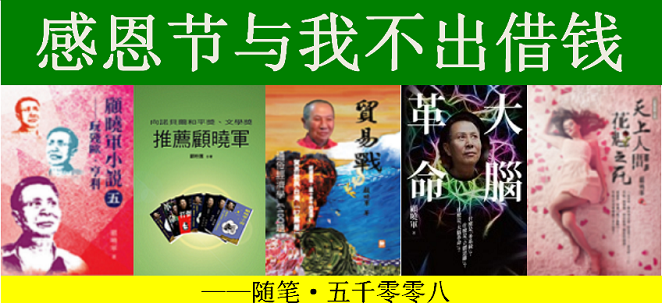 感恩节与我不出借钱 ——随笔·五千零零八 昨,是西方的感恩节。 每年的感恩节,我都不由地想起欧·亨利的短篇小说〈感恩节的先生们〉。 欧·亨利是个左派,他写〈感恩节的先生们〉,既讽刺曾经 ...