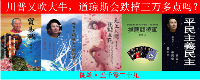 本帖最后由 顾晓军 于 2024-1-2 16:35 编辑 川普又吹大牛,道琼斯会跌掉三万多点吗? ——随笔·五千零二十九 川普能干,我知道;川普爱吹牛,我也知道。我还知道,川普不仅爱吹牛,且会吹牛,比如 ...