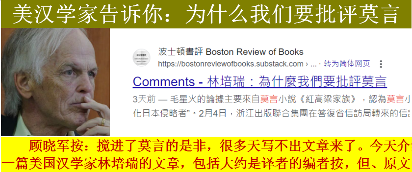 美国汉学家告诉你:为什么我们要批评莫言 顾晓军按:搅进了莫言的是非,很多天写不出文章来了。今天介绍一篇美国汉学家林培瑞的文章,包括大约是译者的编者按,但、原文的有一段只能删除,好在与莫言没有 ...