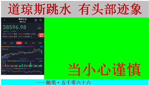 道琼斯跳水,有头部迹象,当小心谨慎 ——随笔·五千零六十六 昨夜,道琼斯跳水。跌幅虽只有1.35%,但在日K线上已形成头部;且,跌破前期放巨量的小阴线。估计,如后将受均线压制,短时间内很难突破。 ...