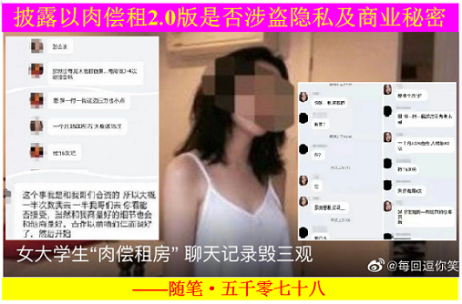披露以肉偿租2.0版是否涉盗隐私及商业秘密 ——随笔·五千零七十八 「以肉偿租」。记得,我曾以此为内容写过一篇文;可,如今已出2.0版了。 网文〈中国女大学生“以性换租” 房东竟要求2人轮 ...