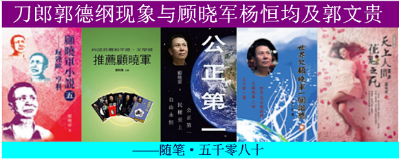 刀郎郭德纲现象与顾晓军杨恒均及郭文贵 ——随笔·五千零八十 有几天没写文了,来篇阅读随想。 见〈网友点评:刀郎现象和郭德纲现象(组图)〉,读了,没读出啥感觉来;细想想,大概是刀郎没啥 ...