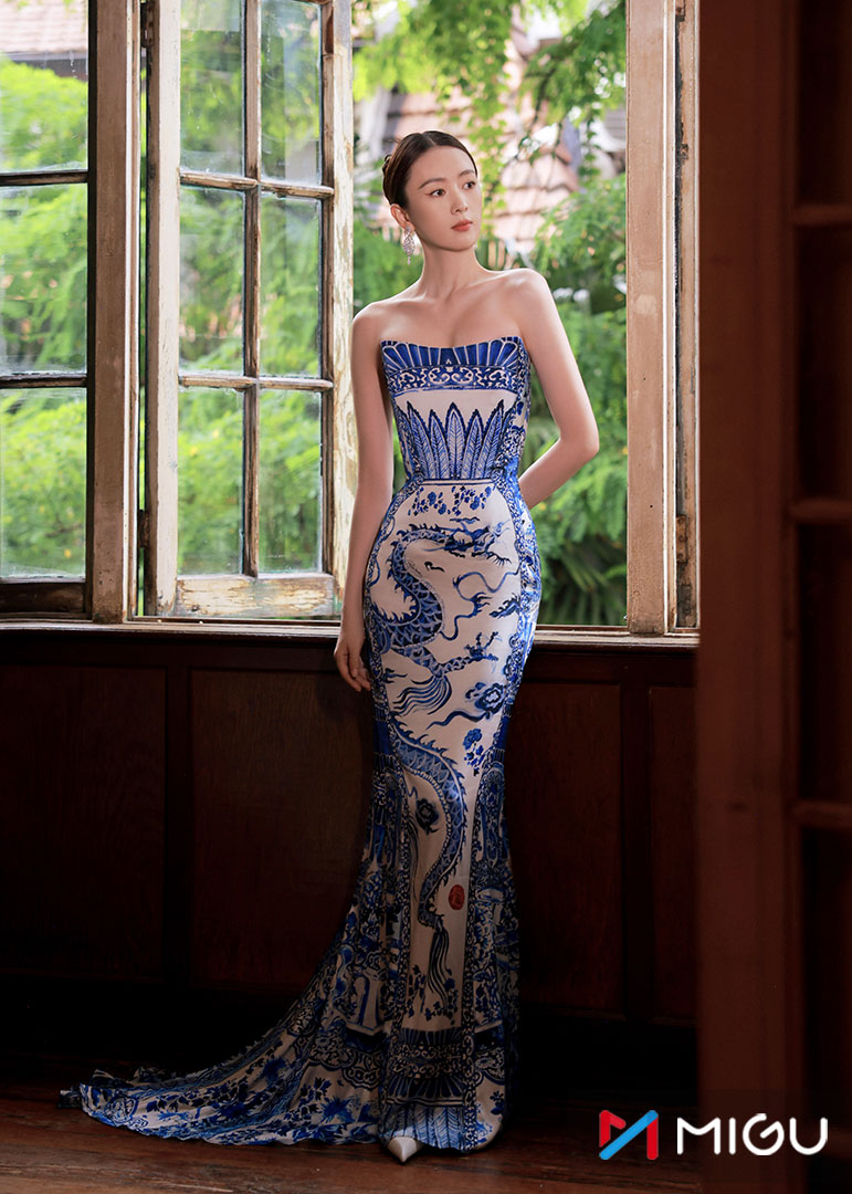 童瑶身着来自2005年的古董青花瓷瓶裙,如古雅画卷舒展于身,素雅钴蓝,青花瓷韵。将瓷器元素融入服装中,以现代时装之美致以东方诗意与优雅,呈现典藏之作。