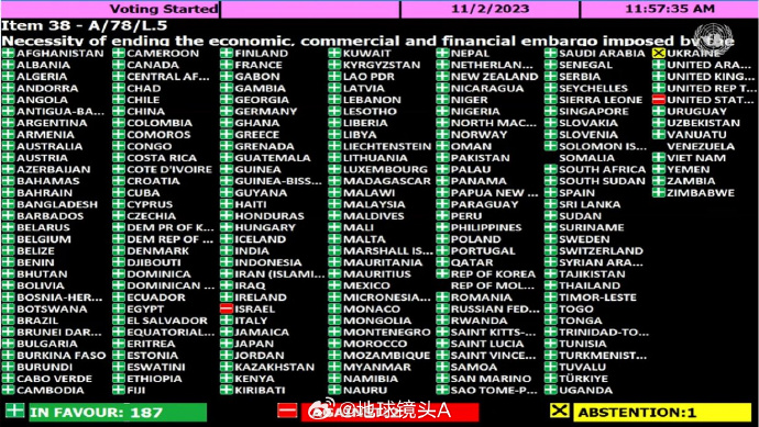 地球镜头A 联合国大会投票,几乎全体成员国投票赞成终止对古巴的封锁,但以下情况除外 反对: 美国 以色列 弃权: 乌克兰 拜登上周分别拨付给乌克兰,以色列80亿美元。 真巧,呵呵。 & ...