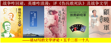 战争咋回避,英雄咋浪漫:评《伤兵敢死队》及战争文学 ——请AI写的文学评论·五千二百一十八 第一位AI,早把〈血火交织中的英雄群像与民族悲歌——评顾晓军《伤兵敢死队》〉写出来了。 昨日,我对 ...