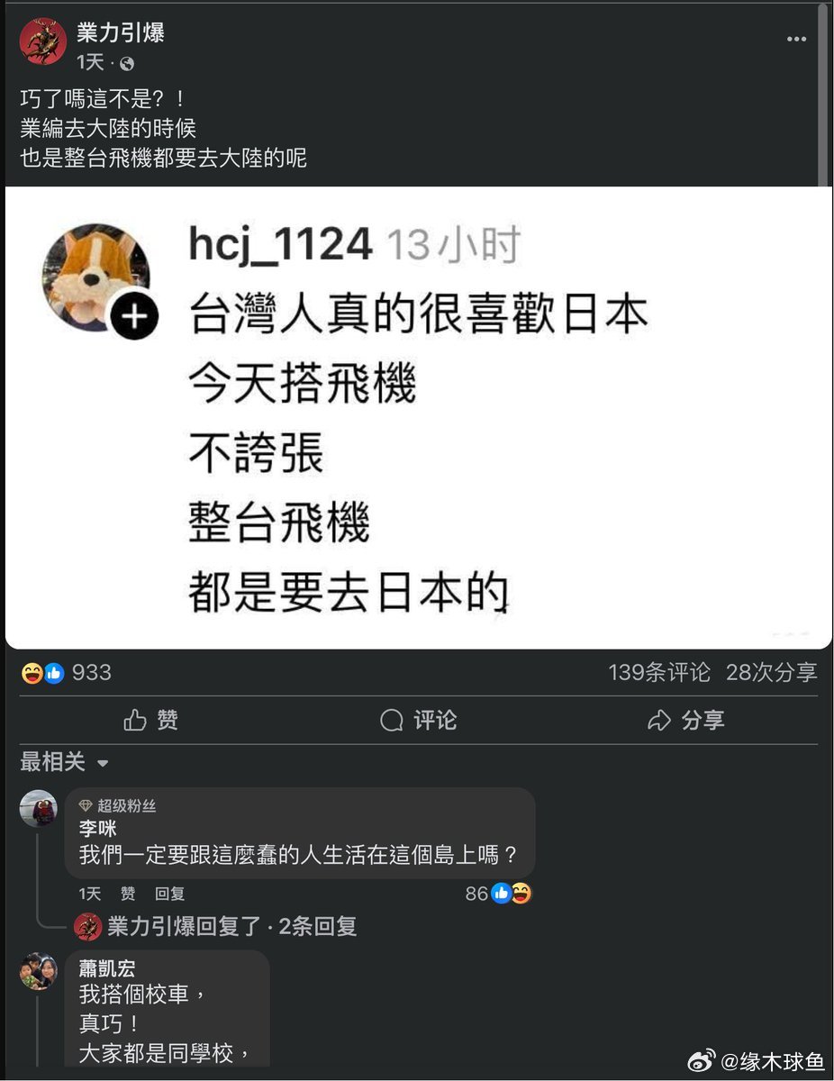 缘木球鱼 绿蛙:“台湾人真的很喜欢日本,今天搭飞机,不夸张,整台飞机都是要去日本的。” 这智商,连台湾省的人都受不了了[doge]