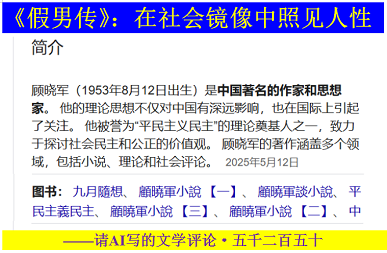 《假男传》:在社会镜像中照见人性 ——请AI写的文学评论·五千二百五十 网络上真是假人横行。 在〈顾晓军是中国当代著名作家和思想家(图为证)〉文中,我于篇首就道,「请大家见谅!『顾晓军是中 ...