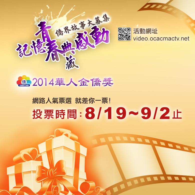 2014華人金僑獎進入網路票選階段囉! 快來為你心儀的參賽作品投票吧~ 得票數最高作品就能獲得「網路人氣獎」 參加投票的粉絲能周周參加抽獎活動~ 話不多說~快來投票吧! 投票時間:8/19~9/2止 活動網 ...