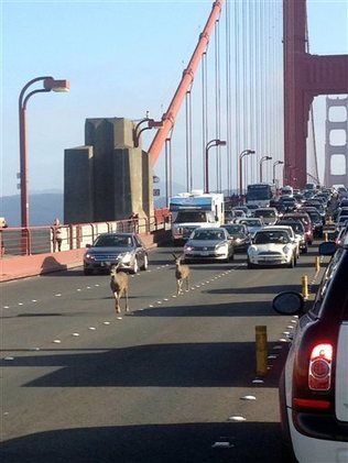 本帖最后由 casper 于 2014-9-6 21:27 编辑 综合新闻 5日早晨,两只鹿出现在旧金山金门大桥上,造成了长达30分钟的堵车。 两只鹿沿着金门大桥向北方前进,从城市的方向去往郊区。加州高速公路 ...