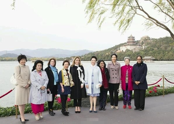 东网 彭丽媛(右5)与一众领袖夫人合照。(互联网) 北京亚太经合组织(APEC)峰会今早召开期间,中国国家主席习近平夫人彭丽媛邀请部份领导人和代表的夫人参观北京颐和园,期间她多次向其他领袖 ...