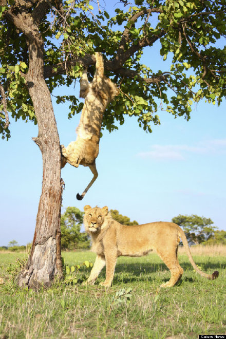 赫芬顿邮报 最近狮子都怎么了?昨天,先是一只狮子被牛群吓得逃上了树,今天赫芬顿邮报分享了一组图片,又有一只狮子爬上了树,但是因为爪子插得太深,卡在树上下不去了,它的兄弟一开始只想安静围观的,不过最后 ...