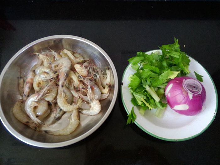 用料;海虾400克,洋葱1个,芹菜50克. 调料;油.盐.料酒.先抽.姜.蒜.八角.花椒.桂皮.胡椒粉.淀粉. 做法; 1.海虾剪去虾芒,挑去虾线,漂净沥干. 2.洋葱洗净切粗条, 3.用料酒,胡椒粉,盐,腌制15 ...