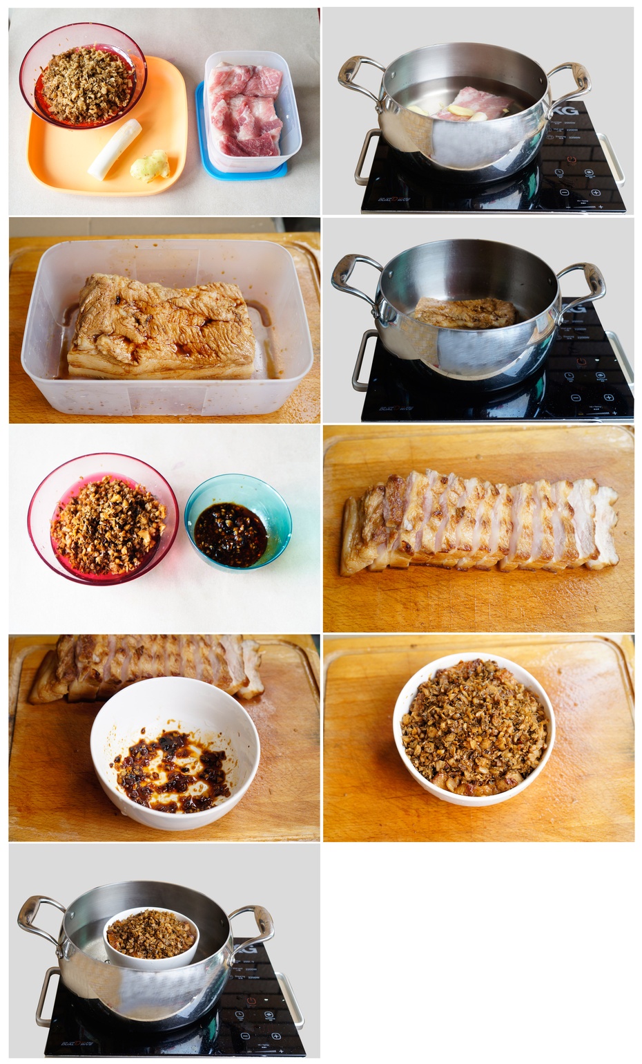 梅菜扣肉 食材:五花肉500g,梅菜干适量 葱白 姜片 调料a:料酒、白糖、老抽、生抽 调料b:蒜蓉豆豉酱,白糖,生抽,老抽,料酒,五香粉 做法: 1、准备好食材。 2、将五花肉切成正方块 ...
