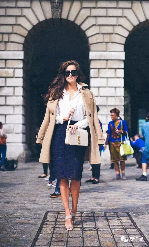 欧洲女人都喜欢风衣配白衬衫+铅笔裙