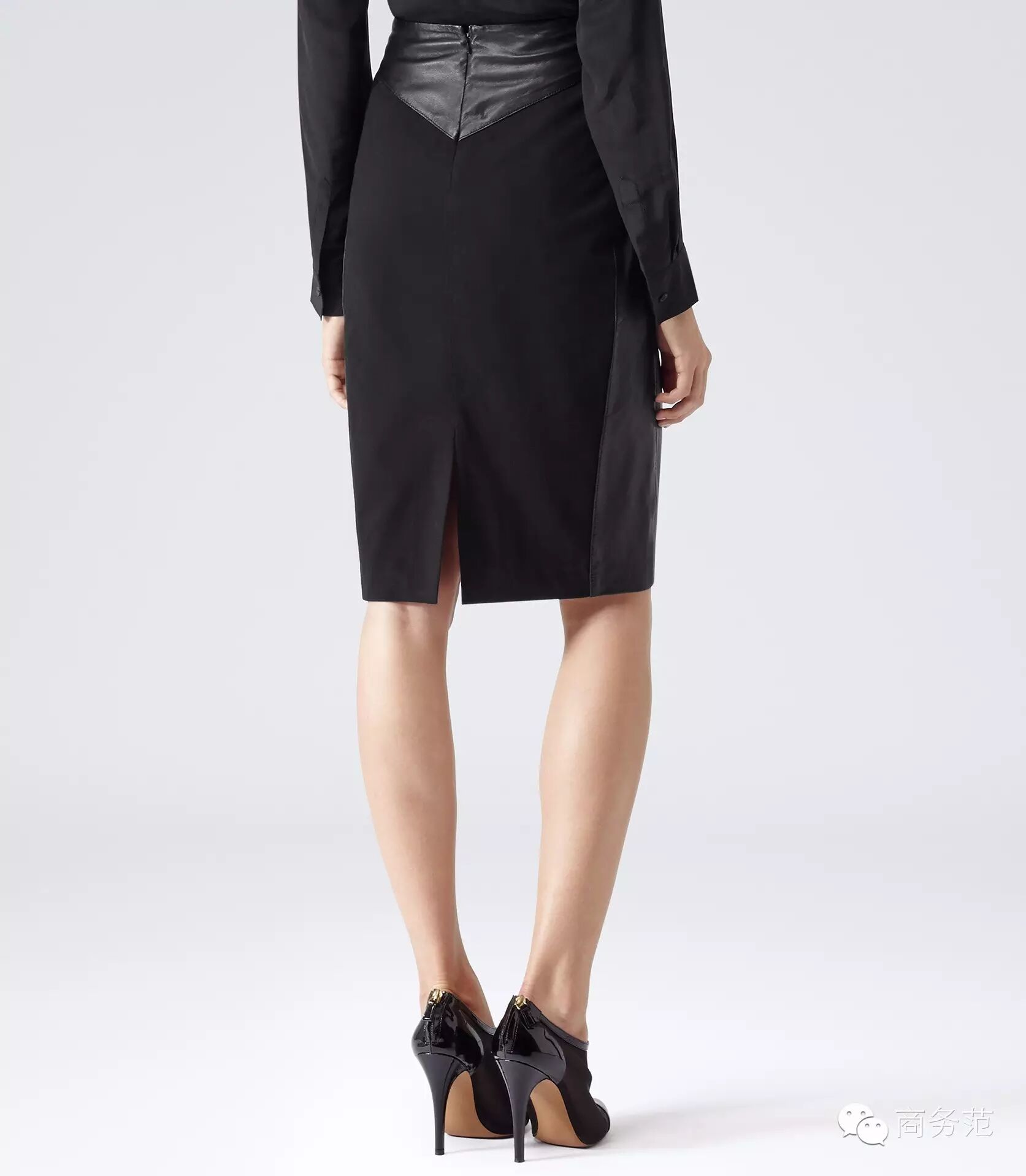衬衫一颗扣子down,设计感铅笔裙拉链up ↑ ,拼色高跟鞋。职业又性感。