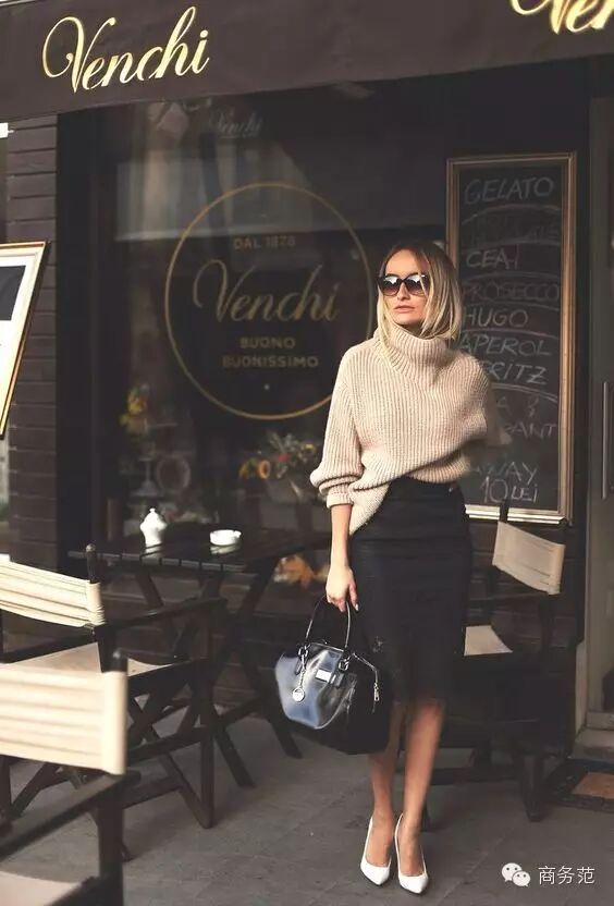 不光是衬衣,针织衫也可以搭配铅笔裙。不要怕毛衣会显得太臃肿,这种松松的慵懒穿搭就是时髦。同样注意是只赛前面一点,千万不要把整件毛衣都塞进去!那样就是真的臃肿了, 一坨毛衣挤在裙子里 _(:зゝ∠)_