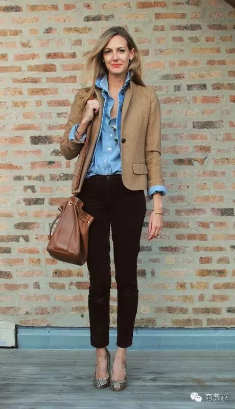 大多数人在素色Blazer里习惯穿薄一些的衣服,显得过于正经。其实配上单宁,在手腕处翻卷露出单宁颜色和铅笔裤尽显干练风格。