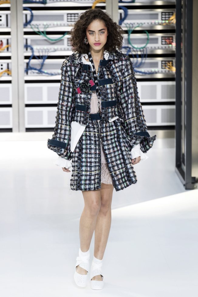 创意总监卡尔拉格斐对於新时代科技的追求从不停止,这样的精神在2017春夏系列中展现地淋漓尽致。延续上一季秋冬运用网路世代表情符号语汇为灵感的主题设定,CHANEL持续用设计串联全球化议题与新世代生活型态,「数据世界」主轴随处可见,从经典的斜纹软呢外套、洋装甚至是帽子上都可见到宛如电路板、电缆线的样式与色彩,缤纷交错出活泼亮眼的风格。开场刻意安排身穿黑、白斜纹软呢套装的模特儿戴上机器人头盔、手套、长靴,展现经典与未来的融合趣味感。