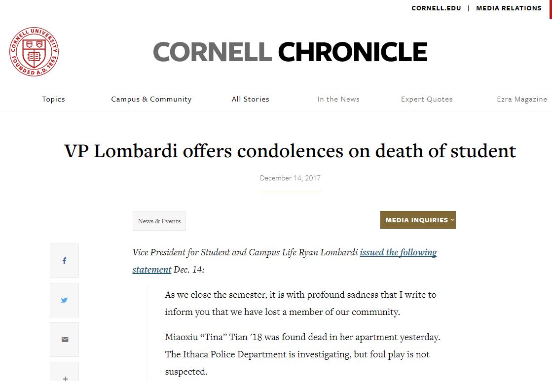 康乃尔大学学生事务暨校园生活部副主席隆巴尔迪(Ryan Lombardi)14日发布了有关田苗秀死亡的声明。