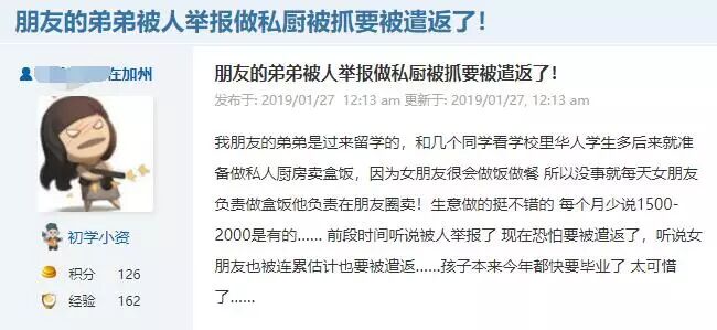 近日,有网友在洛杉矶华人资讯曝光台上发了一个帖子,自己朋友的弟弟和自己的女友在美国做私人厨房,生意不错,但不曾想却被人举报,不但现在生意没了,甚至要面临被遣返的命运!人生与前途也毁于一旦。