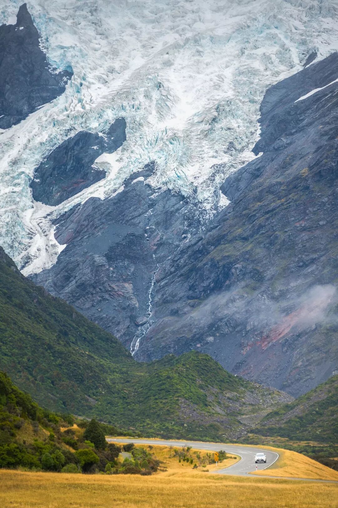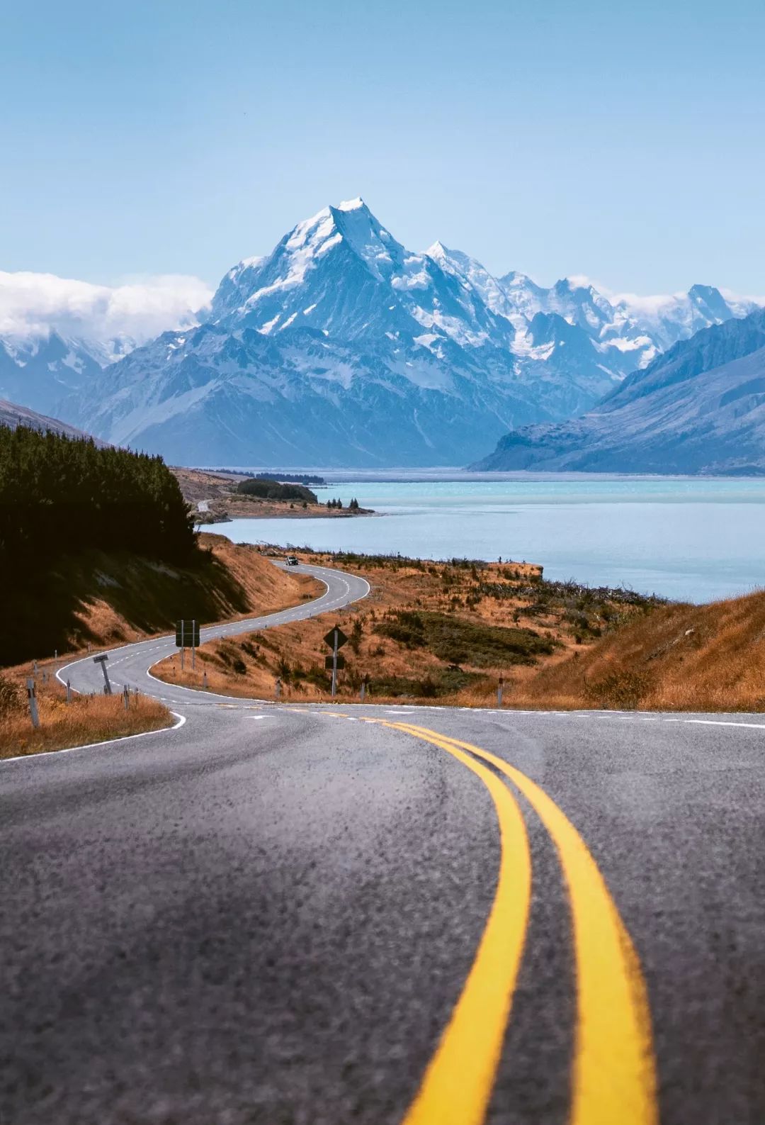 山脉之上 26座雪峰高耸矗立 其海拔均超过3000米 较之北岛的山峰更加宏伟 新西兰的最高峰亦坐落于此 库克山 (Mount Cook) 海拔达3724米 在毛利语中被称作 “穿云之山” (库克山,毛利语中称奥拉基/Aoraki,即“穿云之山”,摄影师@鱼头yutou)
