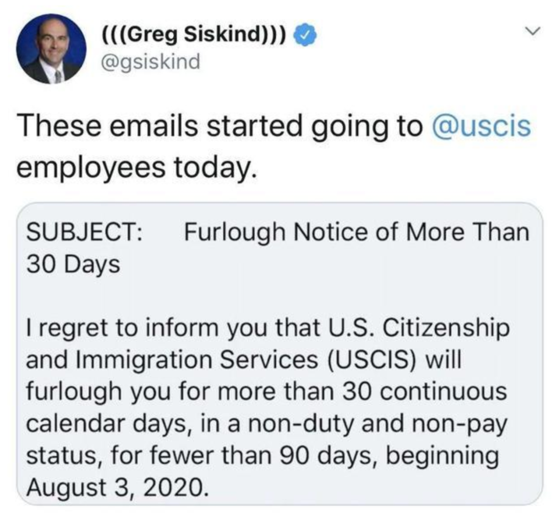 从移民局发给雇员的信中显示,从2020年8月3日开始,USCIS将以休假和无薪状态休息30天,持续不超过90天。