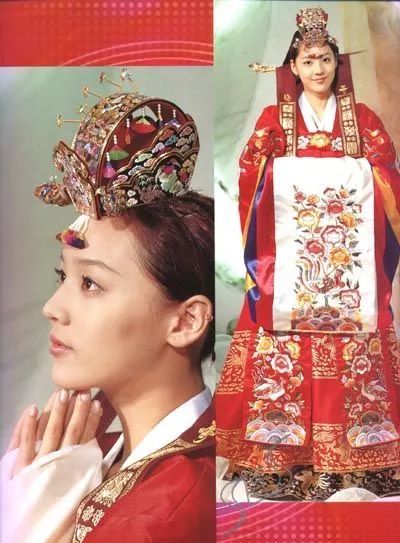 缨络垂旒,玉带蟒袍,着百花裥裙,穿大红绣鞋。