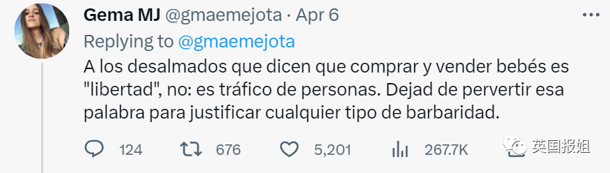 “那些觉得代孕无可厚非的人,我告诉你们:这是人口贩运。请停止美化代孕,停止为任何形式的野蛮行为辩护。”