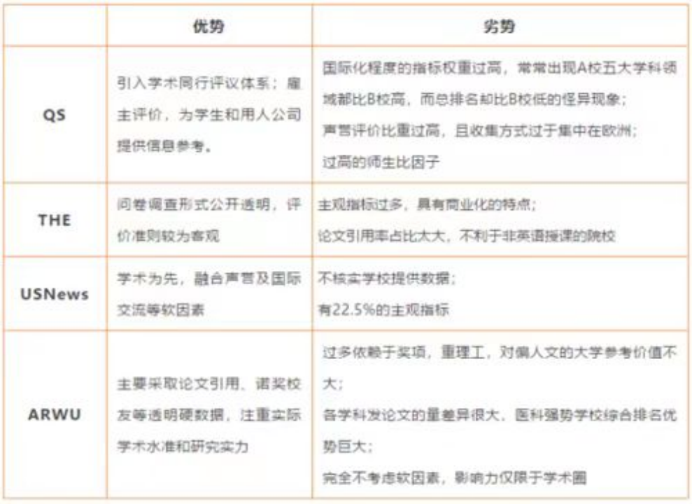 也正是因为部分比较主观和商业化的研究指标,QS排名曾多次在社会舆论中受到批评。 今时今日,QS公司,泰晤士高等教育,U.S.News,ARWU是民间在国际上较为成熟且有公信力的四大排名机构。