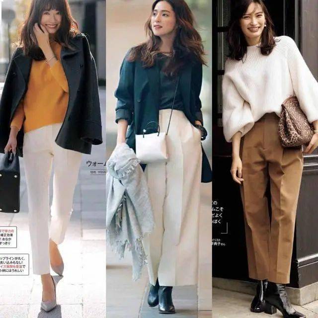 条纹的干净针织衫搭配白色西装烟管裤,整套搭配呈现出沉稳又气质的感觉。米白色风衣搭配高级灰的直筒裤,配色特别的舒适,整体又能够彰显出知性大气范。