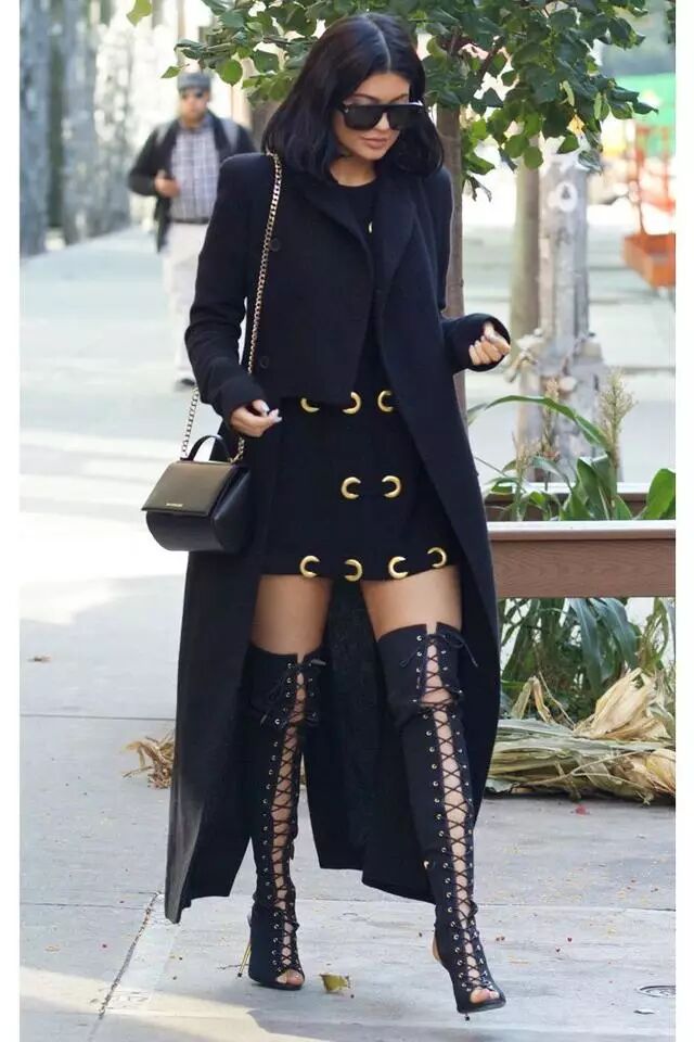当然小编是不太推荐靴子的样式太过花样,不然会显得很廉价,比如下图金小妹她妹Kylie Jenner穿的这双Tom Ford 高筒靴,虽然也要好几千大洋,但是就是摆脱不了一股浓郁的TB Style。