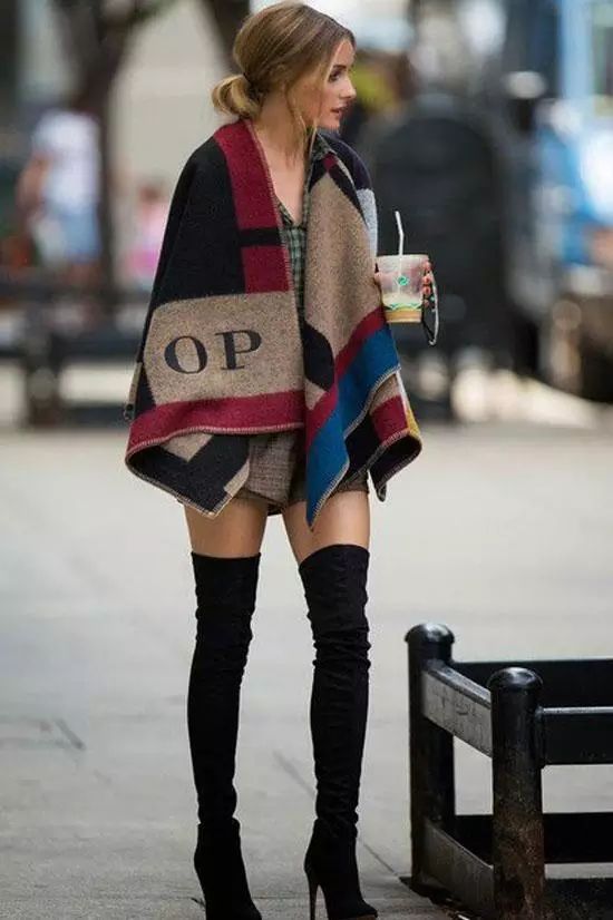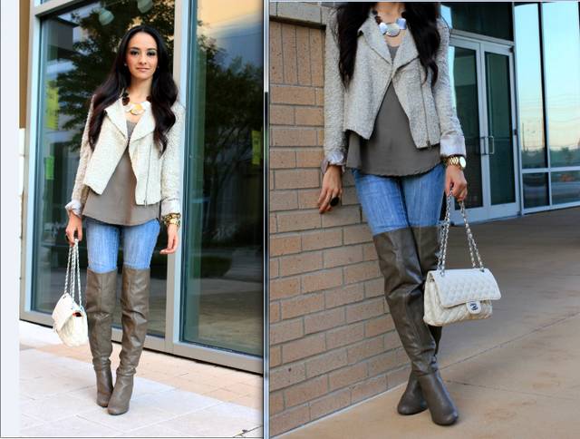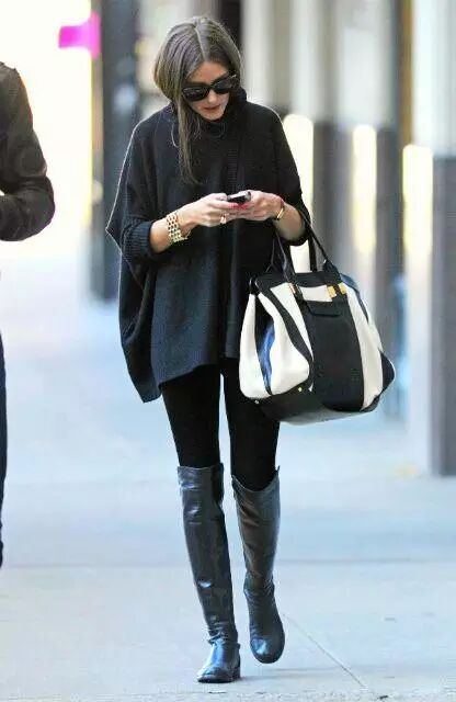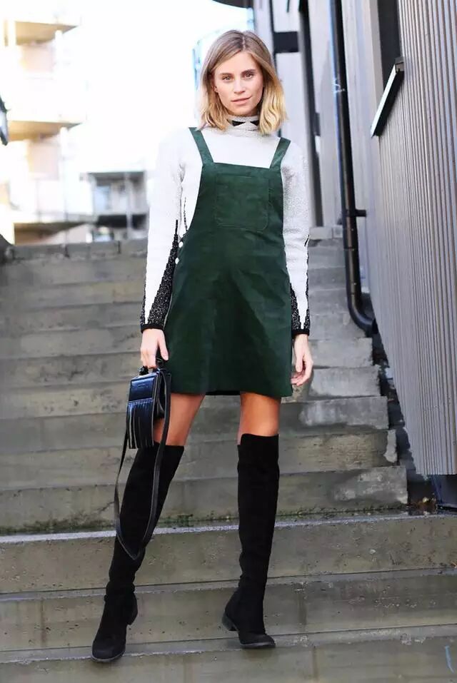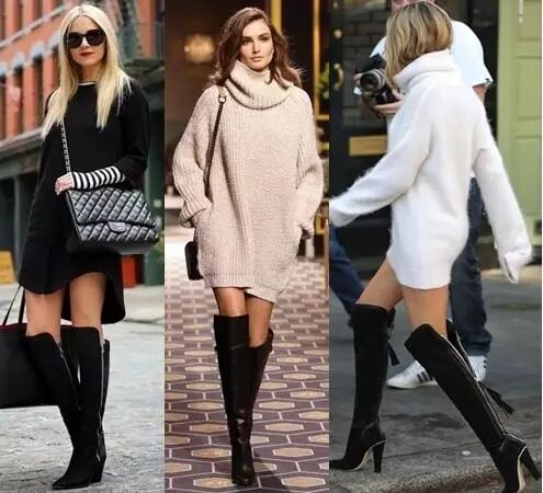 过膝长靴+毛衣裙的搭配,长靴和毛衣裙是必备,像呢子大衣啦、围巾啦、长筒袜啦是选配。
