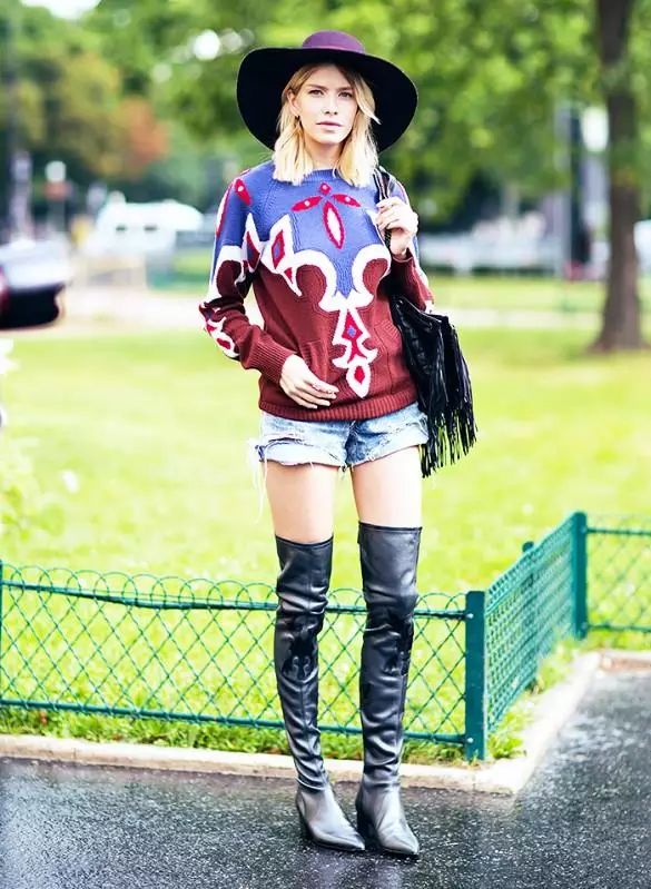 淑女宽沿小礼帽+运动印花毛衣+朋克破洞牛仔+性感过膝长靴,混搭起来也算风格独特。