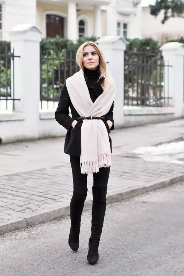 如果牛仔裤和上衣都是黑色,整身搭配颜色显得太单调,那就选一条白色围巾巧妙运用一下,也能增加几分时尚感。