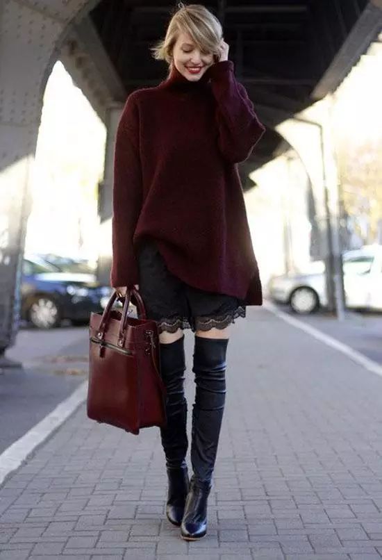 比如说时尚博主ohh couture,就喜欢宽松的大毛衣下边搭配一个材质完全不同的蕾丝边的短裙,看起来的确有层次感的几分。