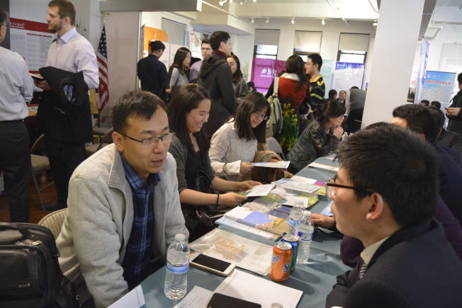 陕西高校专场招聘会的纽约会场上人头攒动,不少来自知名高校的中国留学生来此争取回国发展机会。(记者俞姝含/摄影)