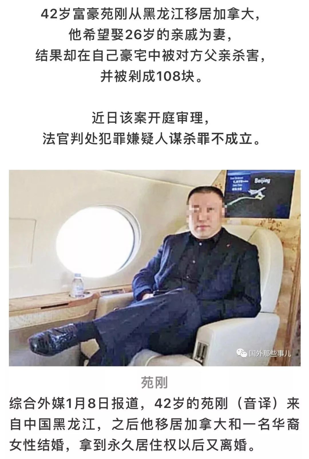 42 岁富豪苑刚从黑龙江移居加拿大,他希望娶26岁的亲戚为妻,结果却在自己豪宅中被对方父亲杀害,并被剁成108块。新晚报报导,近日该案开庭审理,法官判处犯罪嫌疑人谋杀罪不成立。