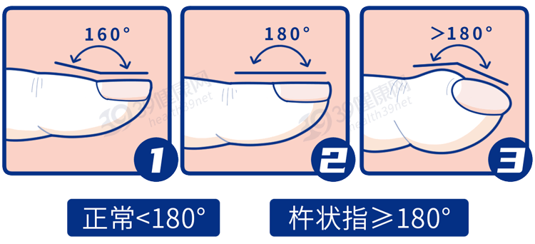 杵状指是指手指末端增生、肥厚,如杵子一般膨大,指甲的末端皮肤与指甲的基底角会≥180°,其中又以拇指最为明显。