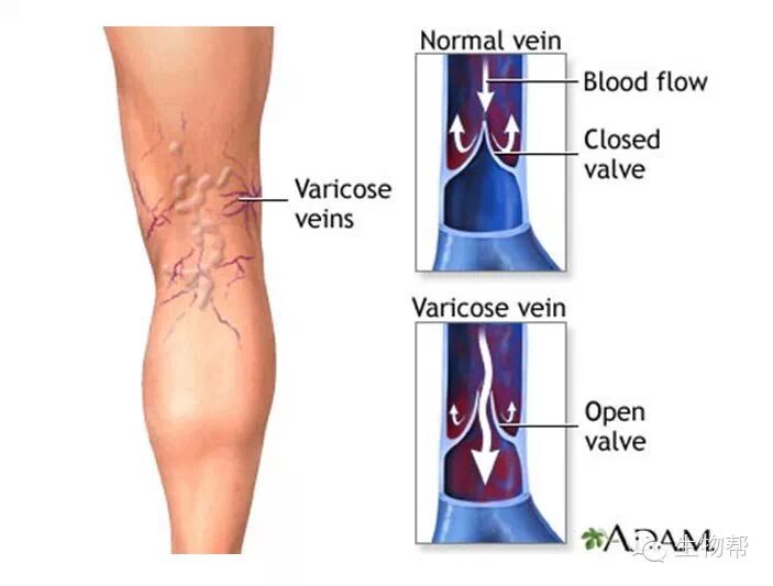 正常人的静脉瓣可以帮助静脉完成下肢血液的回流(上图),而静脉曲张的病人主要表现为静脉瓣的功能障碍(下图),在这种情况下增加局部血流会加重静脉回流的负担.