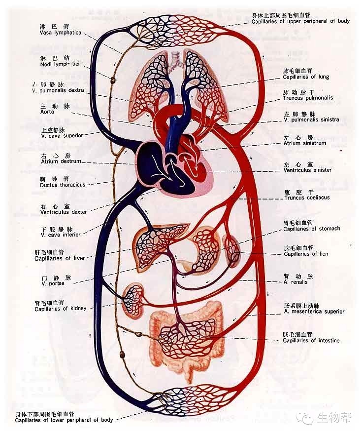 从血液循环的示意图可以看出,体循环由许多相互并联的血管组成,而热水泡脚最先只是改变身体下肢局部的血液循环,这种改变在短时间内不会对体循环有太大的影响。